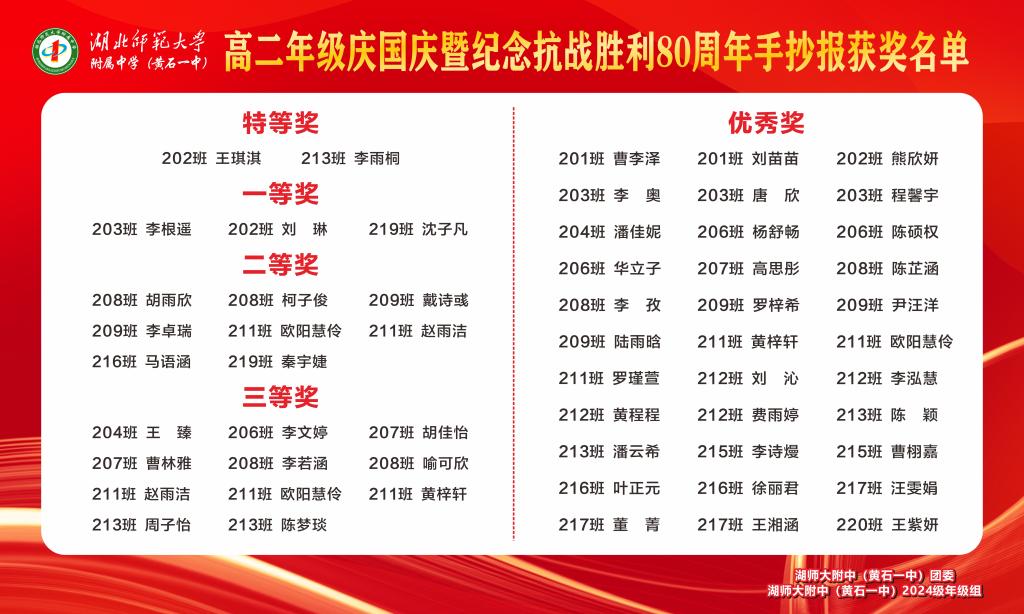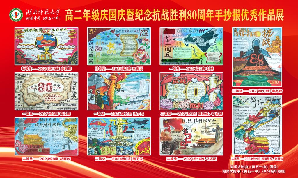 为庆祝中华人民共和国成立76周年,纪念中国人民抗日战争暨世界反法西斯战争胜利80周年。近日,我校团委、高二年级组联合举办了庆国庆暨纪念抗战胜利80周年手抄报评比活动。本次活动旨在厚植学生的家国情怀,弘扬伟大的爱国主义精神和抗战精神,展现湖师大附中(黄石一中)学子昂扬向上的精神风貌。