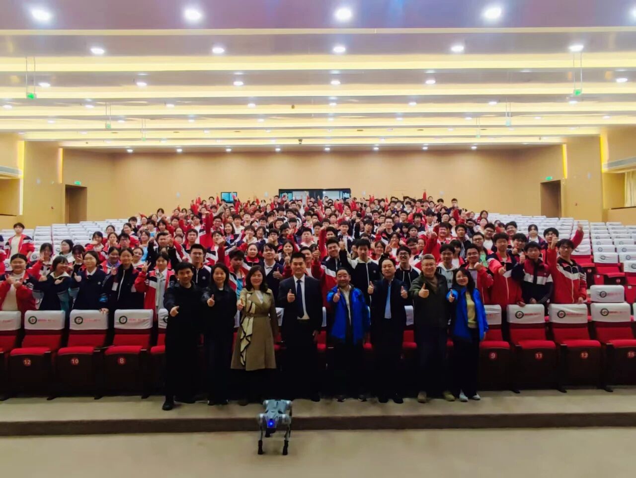 为增强讲座的趣味性与互动性,梅逸校友特请上了AI机器狗并邀请同学们上台亲自操作。有想让机器狗腾空翻越的,有想让机器狗立正比心的,有想让机器狗坐下躺倒的……凡此种种,梅逸校友都一一指导。特别是当有的同学问机器狗能不能飞的时候,梅逸校友对学弟学妹们提出了温馨寄语:希望学弟学妹们能拓宽知识边界、深化专业能力、拥抱人工智能,成为兼具跨界素养与创新精神的未来领导者。
