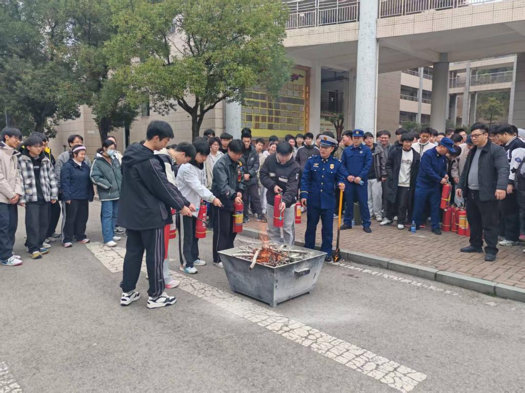 在实操灭火环节,消防员现场示范干粉灭火器“提、拔、握、压”四步标准操作流程,并耐心指导学生代表实操,对准模拟火源根部精准喷射,亲手完成初起火灾扑救。师生通过亲身体验、动手实践,熟练掌握灭火使用技能,真正实现从“听懂”到“会用”的转变。