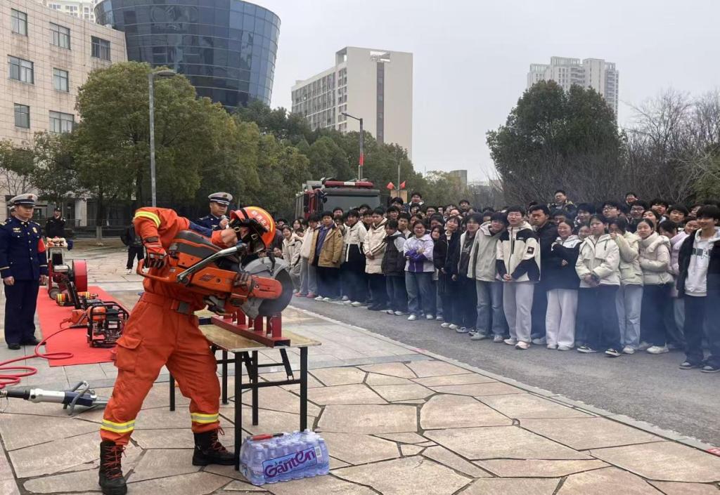 随后,消防大队队员现场开展专业技能展示,快速穿戴防护装备、液压钳精准夹乒乓球、切割机在灯泡上切铁丝等专业操作,动作娴熟、精准高效,赢得阵阵掌声。同时,消防员结合校园实际,细致讲解灭火器、消防栓等常见消防器材的功能、使用方法,以及火场逃生、紧急避险等关键技巧,讲解通俗易懂、内容实用接地气。