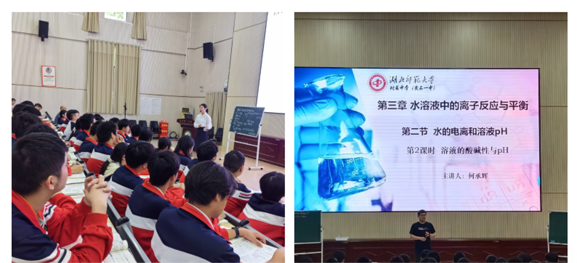 活动伊始,湖师大附中(黄石一中)教务处副主任占涛致欢迎辞。随后,湖师大附中(黄石一中)教师周豆豆、何承辉分别带来《铁盐、亚铁盐及其相互转化》《溶液的酸碱性与pH》公开课。周豆豆老师以血红蛋白引入,结合生活实际激发兴趣,课程涵盖知识归纳与高考真题;何承辉老师凭借精美课件与分组实验,营造活跃课堂氛围,精准突破教学难点。