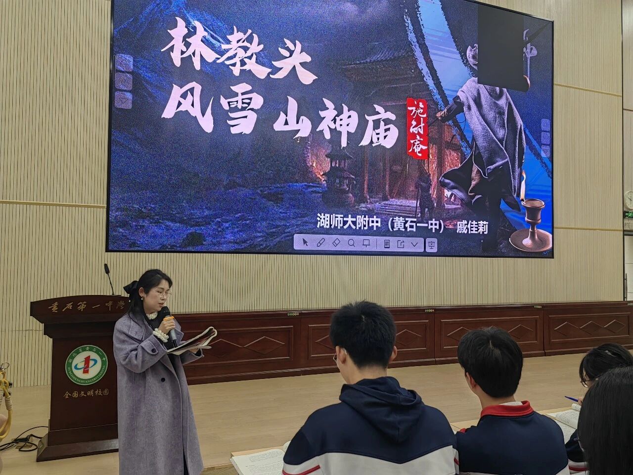 湖师大附中(黄石一中)优秀青年教师戚佳莉带来《林教头风雪山神庙》,以“空间场景”为线索,带领学生对比“李小二酒店”“天王堂”“草料场”“山神庙”四个空间,探究空间变化与人物命运、性格转变的内在关联,并通过情景写作深化理解,突出高中阅读中思辨、重鉴赏的要求。