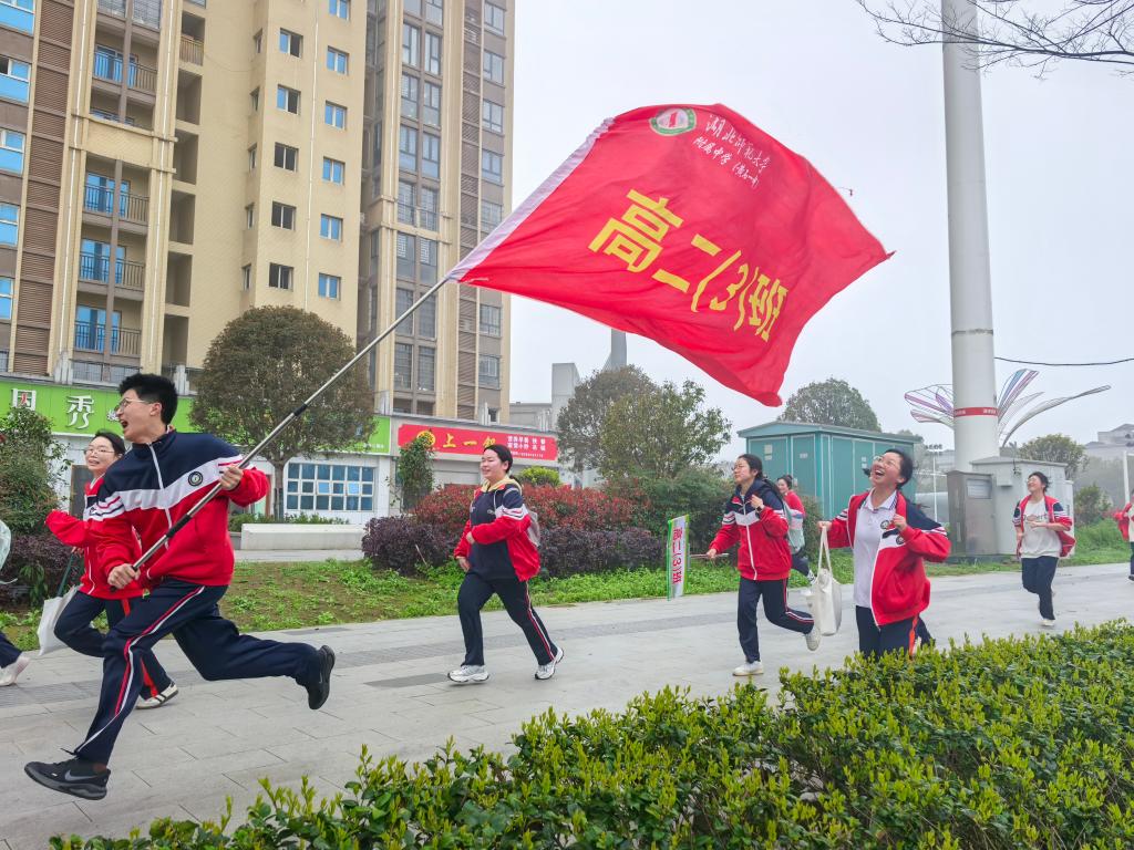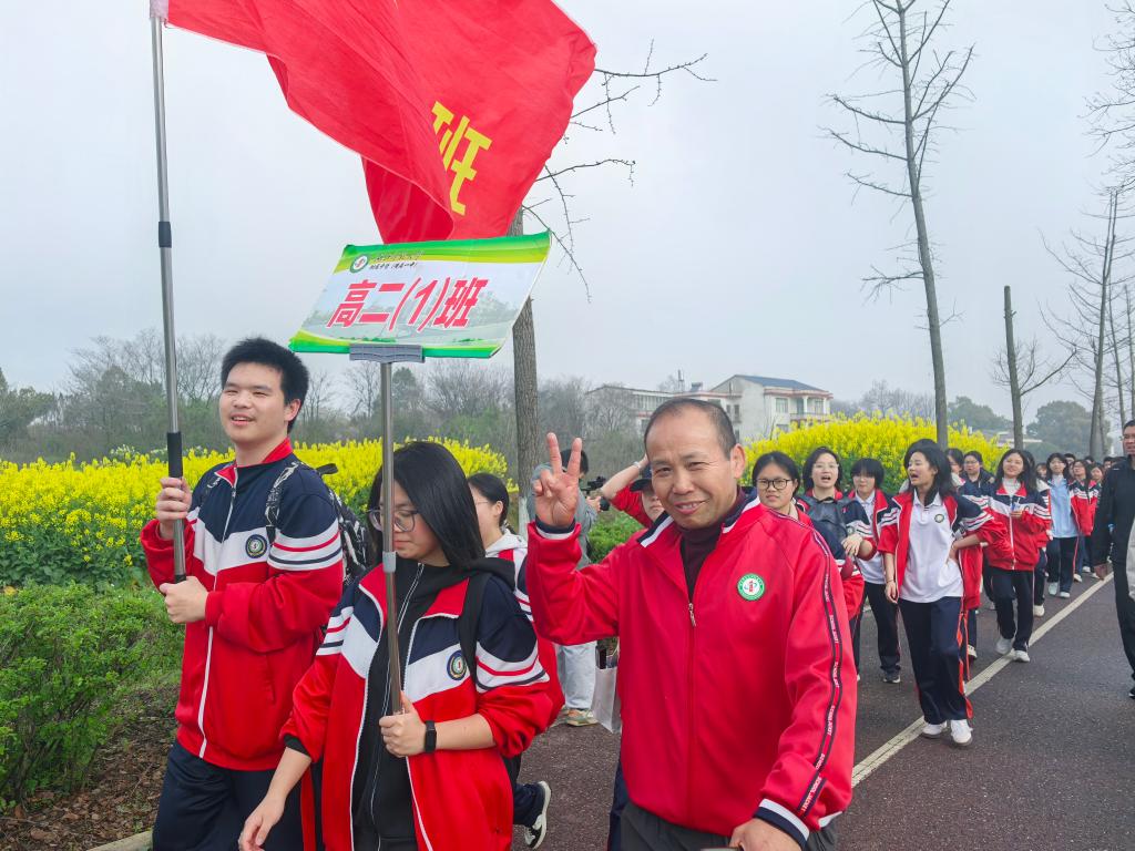 在德育主任陈相如的组织下,全体学生齐声诵读《满江红·出征礼》,慷慨激昂的诵读声回荡在运动场,尽显一中学子的壮志豪情。最后,学校党委书记洪喜郑重宣布远足正式出征,高二教师代表现场击鼓鸣志,铿锵鼓声为出征队伍注入满满力量。7点20分,各班队伍依次有序出发,沿着既定路线向着目的地奥体公园·花客厅稳步前行,长长的队伍绵延有序,成为春日街头一道靓丽的青春风景线。